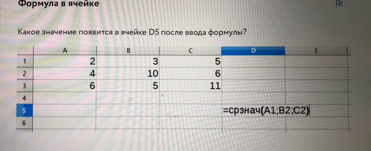 СРЗНАЧ вычисляет среднее значение. Поэтому ответ: 6