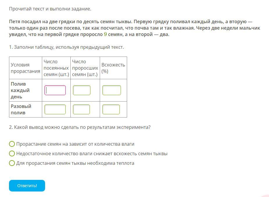 1. полив каждый день - 10 семян - 9 семян - 90%