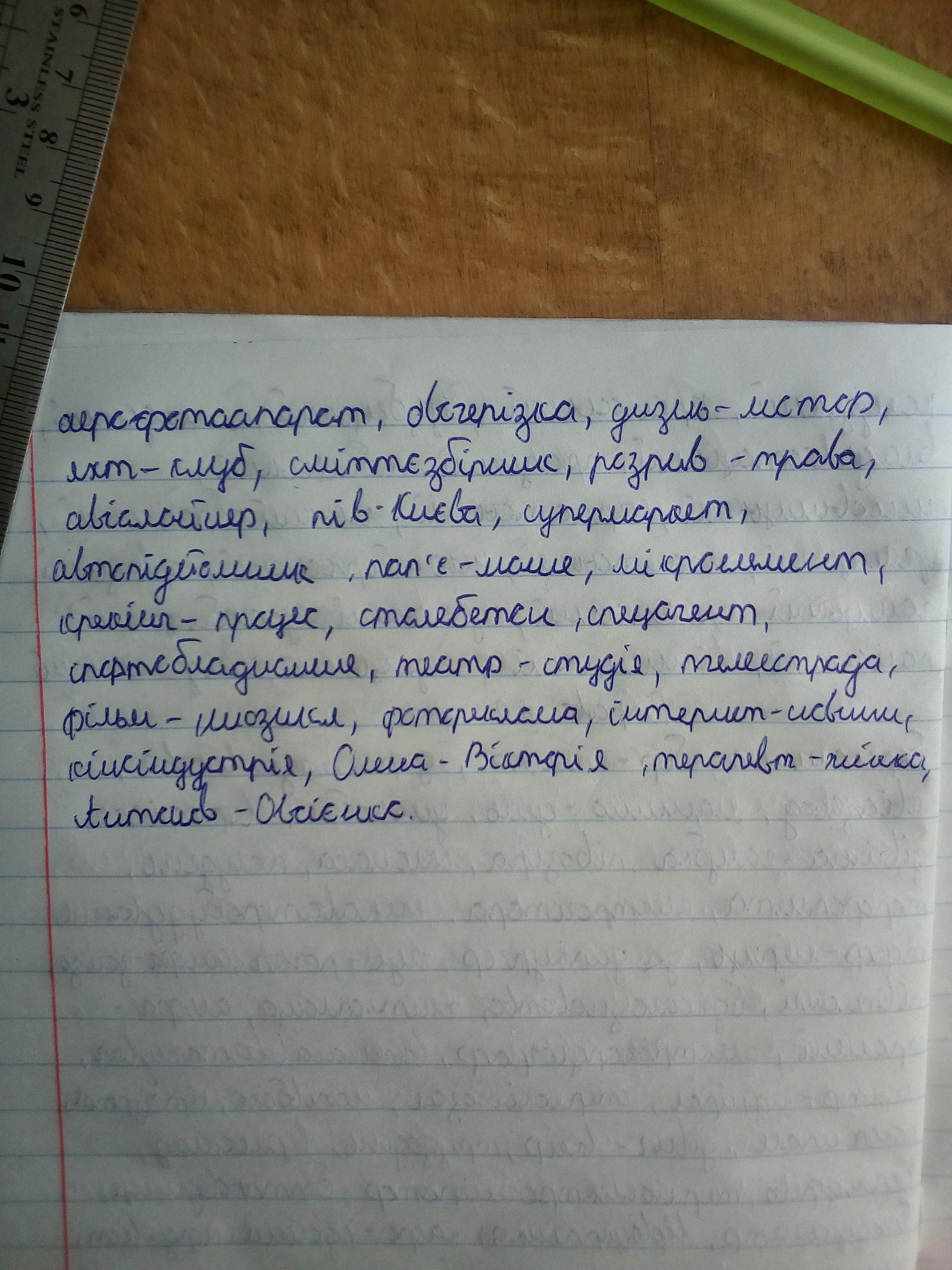 метр, вакуум/фільтр, Ново/українка, кафе/їдальня, норд/вест, генерал/ад’ютант, Лисичка/сетричка, глино/порошок, пів/Африки, люби/мене, Верни/дуб, пасажиро/кілометр, міні/маркет, само/скид, міді/й/максі/спідниці, екс/король, націонал/ліберал, жовто/блакитник, індо/європеєць, гамма/метод, аеро/фото/ апарат, овоче/різка, дизель/мотор, яхт/клуб, сміттє/збірник, розрив/трава, авіа/лайнер, пів/Києва, супер/маркет, авто/підйомник, пап’є/маше, мікро/ елемент, крекінг/процес, стале/бетон, спец/агент, спорт/обладнання, театр/ студія, теле/естрада, фільм/мюзикл, фото/реклама, інтернет/новини, кіно/ індустрія, Олена/Вікторія, терапевт/жінка, Антонов/Овсієнко.