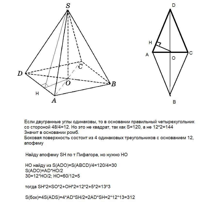Все двугранные углы при основании четырехугольной пирамиды равны между собой. Высота пирамиды равна 12 м, а периметр и площадь основания равны 48 м и 120 м^2. Найдите площадь боковой поверхности пирамиды