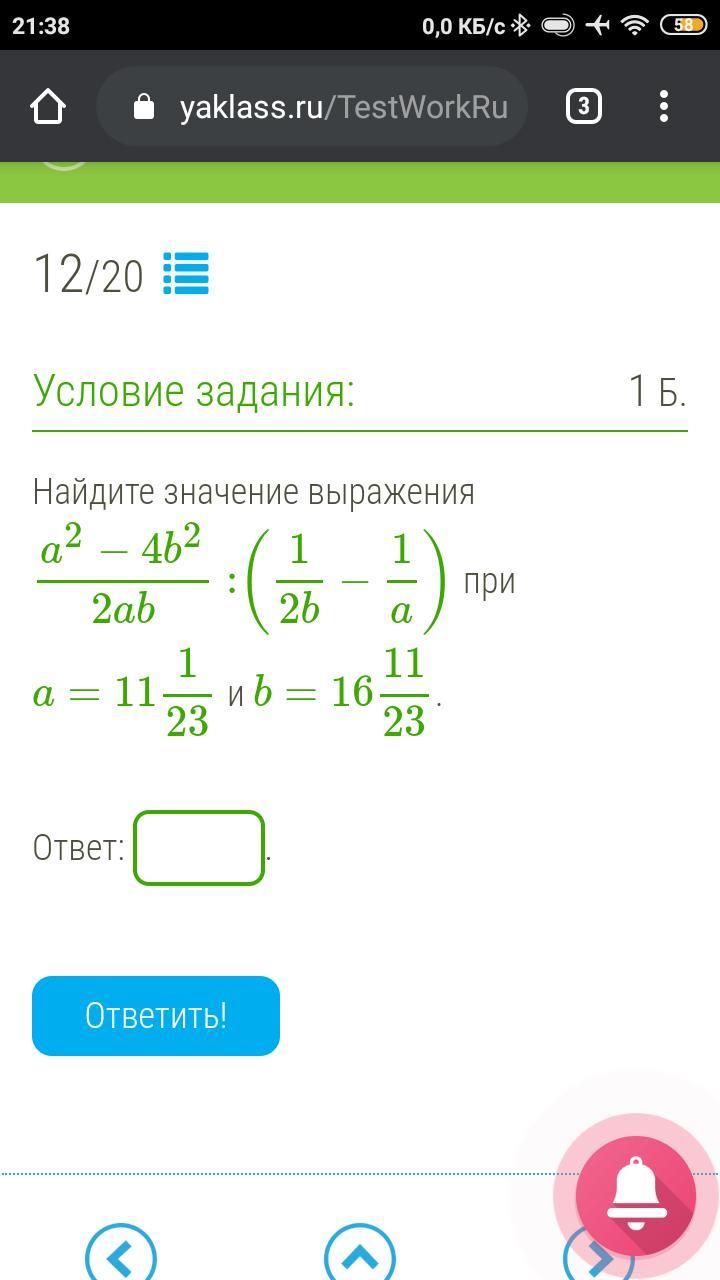 Найти: a^2-4b^2/2ab:(1/2b-1/a) при а=11(целых)1/23 и b=16(целых)11/23.
