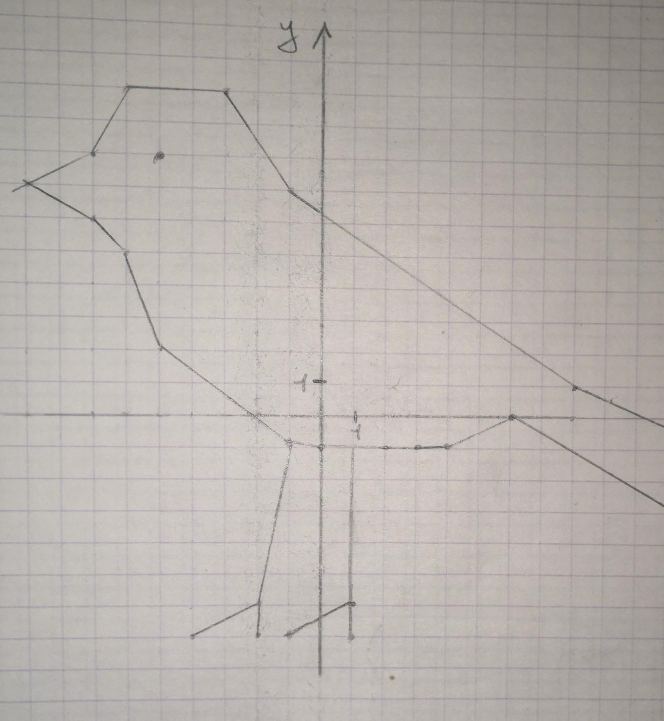 Нужно сделать сделать рисунок Воробья по определённым координатам:(15; -2), (8; 1), (-1; 7), (-3; 10), (-6; 10),