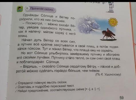 И солнце улыбнулось замершиму путнику и пригрело его своими лучиками.Путнику стало жарко и он сам снял плащ и поблогодарил солнце.