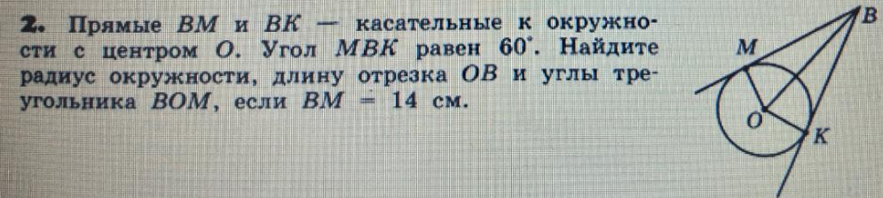 Угол М будет равен 90 градусов по свойству касательной. Так как ОМ - радиус, а ВМ - касательная к окружности, то по свойству касательной ОМ перпендикулярно ВМ, из этого следует, что угол М - прямой, т. е. угол М = 90 градусов.