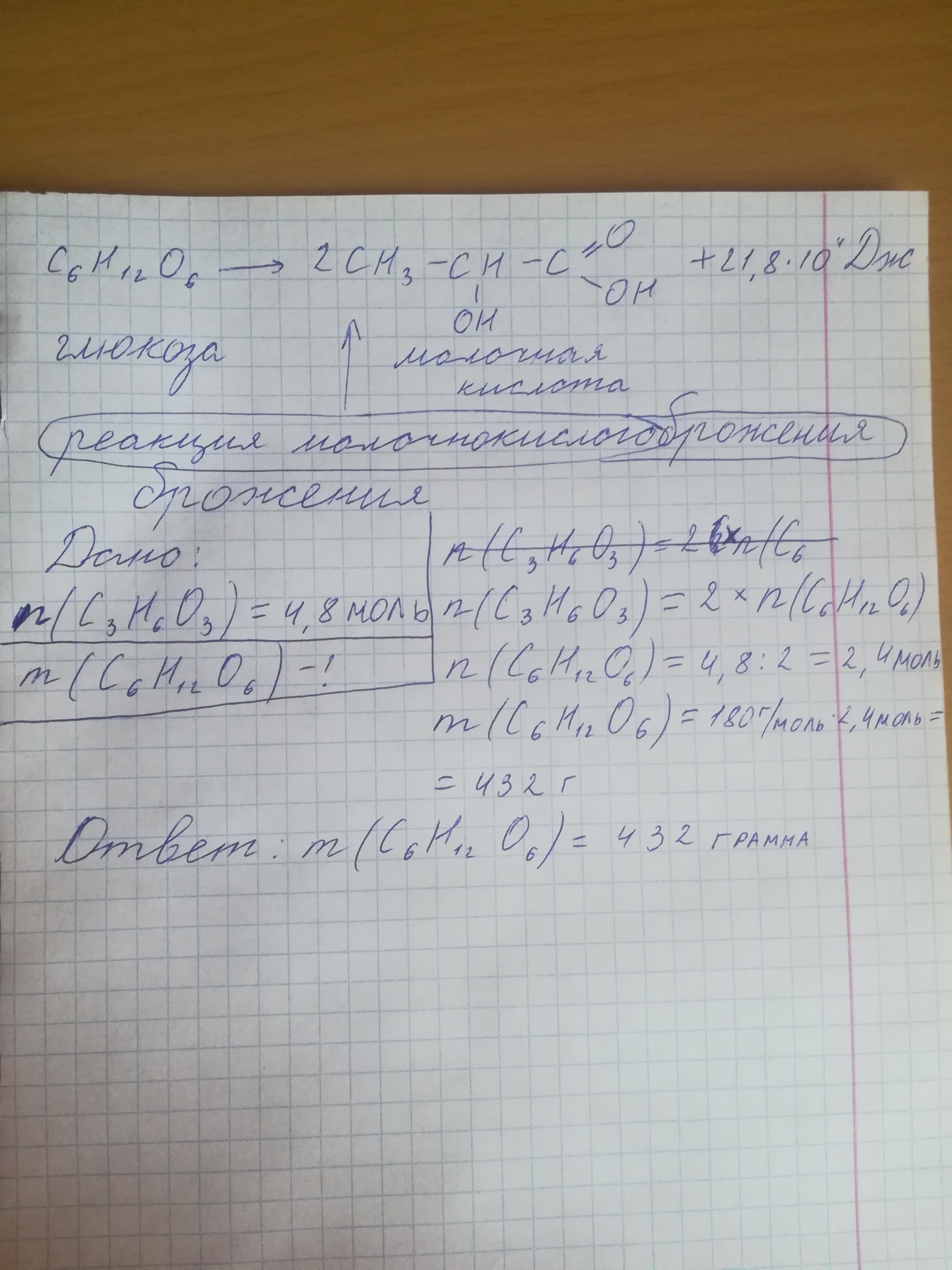 Вычислите массу Глюкозы наследуемого брожения какой одержали 4,8 моль молочной кислоты? Мне не нужна формула, мне надо решение . Пожалуйста ಥ‿ಥ