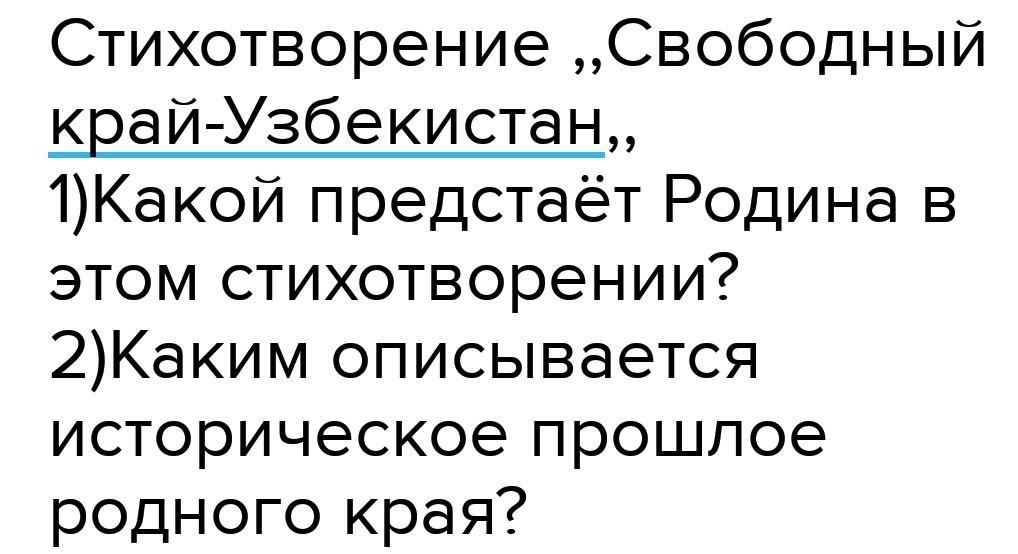 1.В стихотворении "Свободный край - Узбекистан" поэт воспевает самое драгоценное завоевание народа - свободу и независимость Родины. 2.Эркин Вахидов обращается к историческому прошлому родной земли, когда "топтали орды хищно, зло, и на земле заметны раны". Поэт гордится тем, что извечное стремление к свободе и процветанию отчизны, выраженное в эпосах "Алпамыш", Тор-оглы" осуществляется в наше время, и он является непосредственным участником событий. Органично и точно сравнение родины с легендарным богатырским крылатым конем - символом мощи, силы и свободы.