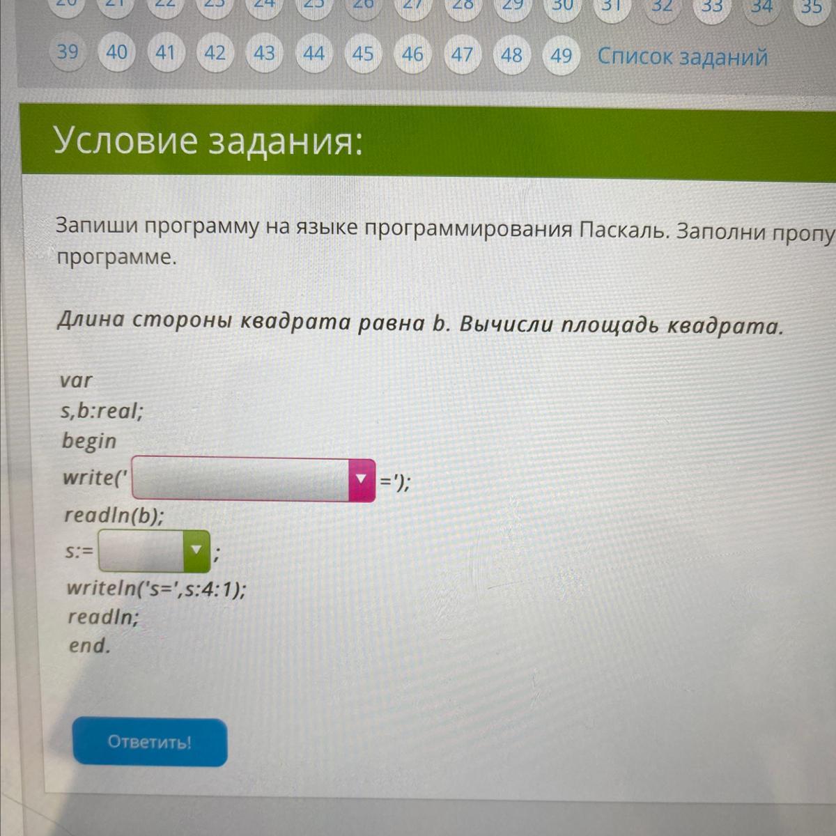 Запиши программу на языке программирования Паскаль. Заполни пропуски в программе. Помогите пожалуйста