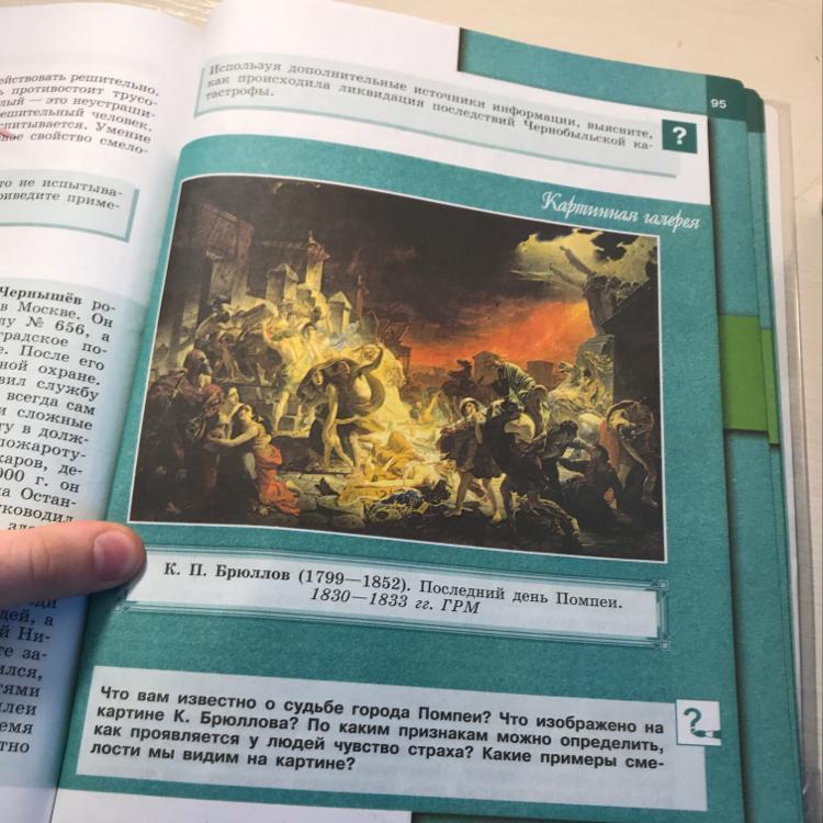 На данной картине изображен последний день существования города Помпеи. Люди хаотично расположены на картине, они бегут, кто куда. Их лица полны разочарования и страха, ужаса.