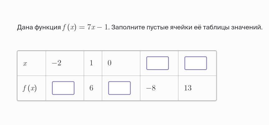 Дана функция f(x) = 7x-1. Заполните пустые ячейки её таблицы значений.​