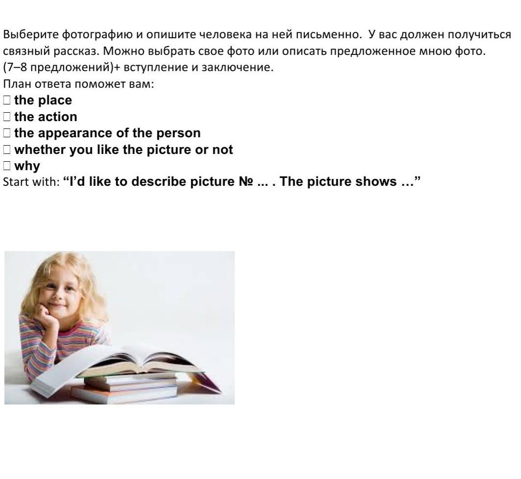 In this photo, the girl is reading a book. I really love to read. This girl has blonde hair. She is about eight years old. I also love to read because it is very exciting. We know the world and humanity. Each writer is good in his own way. I can read a book and start reading