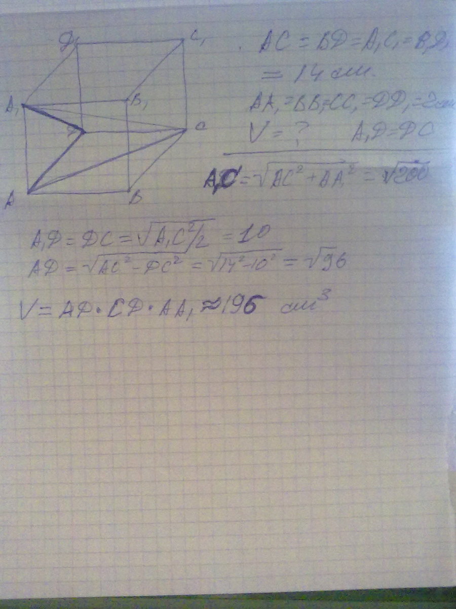 Диагональ меньшей боковой грани прямоугольного параллелепипеда равна большему ребру основания.Высота параллелепипеда равна 2см , диагональ основания равна 14см. Найти объем параллелепипеда