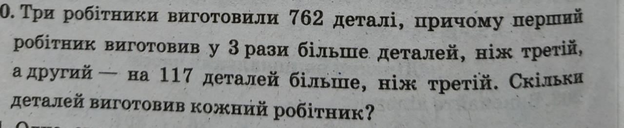 Три робітники виготовили 762 деталі, причому перший виготовив у 3 раза більше деталей, ніж третій, а други-117 деталей більше, ніж третій. Скільки деталей виготовив кожний робітник?