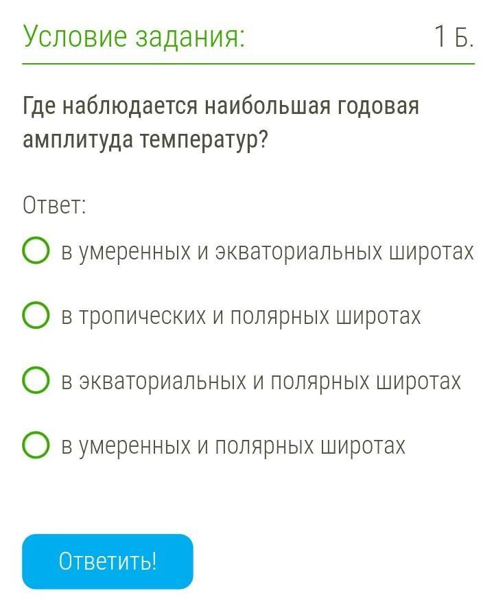 Наибольшая годовая амплитуда наблюдается над сушей, в глубине континентов в умеренных и высоких широтах, где она может достигать 40—50°, а в отдельных местах — даже 65°. Например, в Верхоянске (Якутия) средняя температура июля плюс 15°, а января минус 50°. В низких широтах над сушей годовая амплитуда температуры воздуха сравнительно невелика, что объясняется более равномерным притоком солнечного тепла.Наибольшая суточная амплитуда температуры воздуха бывает в южных широтах, над песчаной поверхностью, в теплое время года, при отсутствии облачности и при малой влажности воздуха, т. е. в сухих южных степях или в пустынях. В этих условиях разность между максимумом и минимумом температуры за сутки может достигать 25-30 и даже 40°.