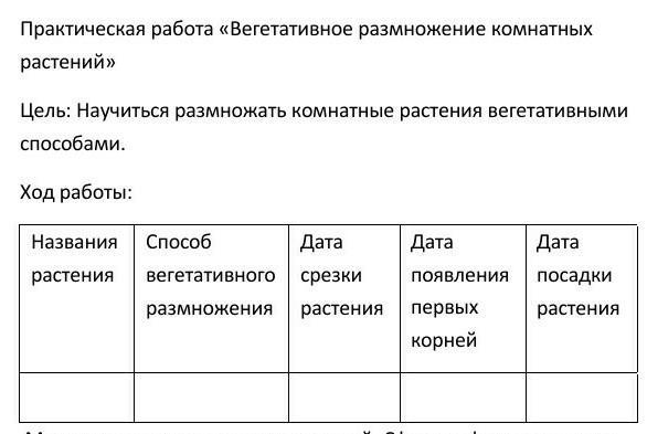 Объясните пожалуйста!Задана практическая работа по биологии " Вегетативное размножение комнатных растений" и дана таблица. Можете пожалуйста сказать как я должна выполнить эту работу, и по возможности какое комнатное растение я могу взять для этой работы?А то я ни черта в биологии не понимаю, даже по данной таблице...
