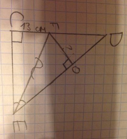 Решение: FE - общая сторона, угол OEF = углу FEC по условию, тогда тр. FOE = тр. FCE по гипотенузе и острому углу. FO = 13 см