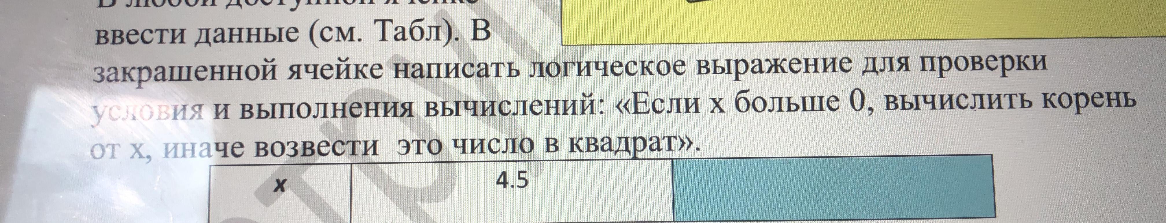 В ячейке записать логическое выражение для проверки условия и выполнения вычислений: «Если х больше 0, вычислить корень от х, иначе возвести это число в квадрат».