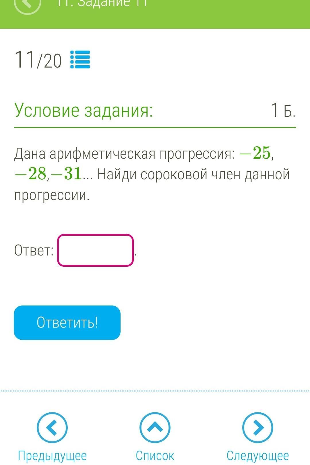 Объяснение: Первое число равно -25, а следующее -28, из чего следует что с каждым шагом отнимается 3, всего между 40-ым и первым 39 шагов, значит от -25 отнялось 39*3, а это 117, значит ответ 142