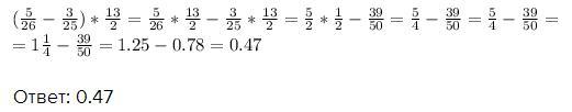 (5/26-3/25)*13/2=5/26*13/2-3/25*13/2=5/2*1/2-39/50=5/4-39/50=1 целая 1/4-39/50=1,25-0,78=0,47