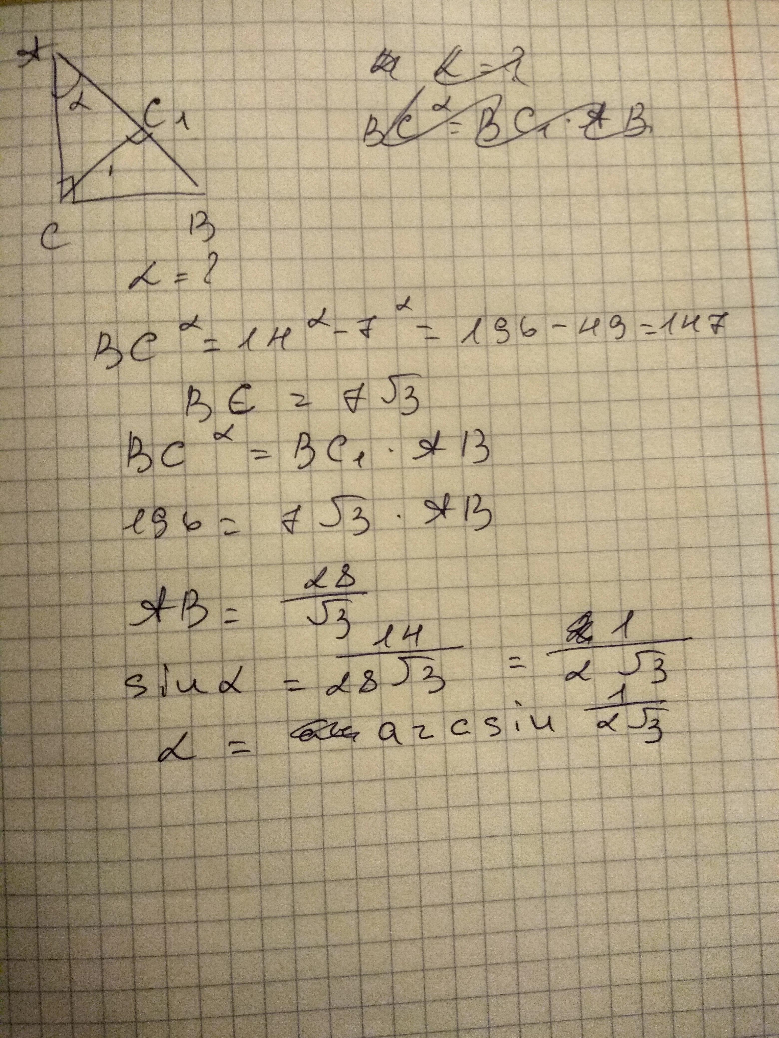 В треугольнике АВС угол С=90 градусов, Высота СС1=7 см,ВС =14 см. Найдите угол САВ