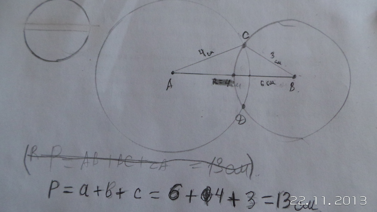 ұзындығы 6 см АВ кесіндісін сызындар. Центрі А нүктесі радиусы 4 см шеңбер сызындар. Центрі В нүктесі радиусы 3 см шеңбер сызындар. Шеңберлердің қиылысу нүктелерін С жөне D өріптерімен белгілендер. ABC үшбұрышының периметрі неше сантиметр?