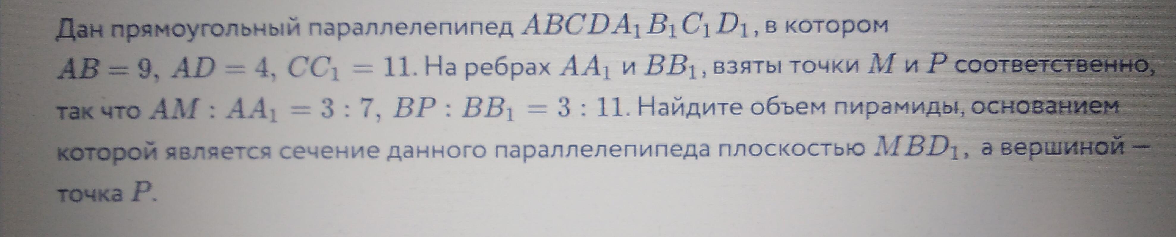 Дан прямоугольный параллелепипед ABCDA1B1C1D1, в котором AB=9, AD=4, CC1=11. На рёбрах АА1 и ВВ1 взяты точки М и Р соответственно, так что АМ : АА1 = 3:7, ВР : ВВ1 = 3 : 11. Найдите объем пирамиды, основанием которой является сечение данного параллелепипеда плоскостью MBD1, а вершиной – точка Р.