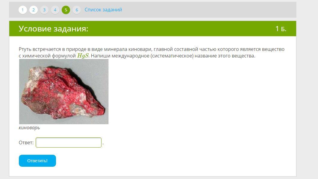 Ртуть встречается в природе в виде минерала киновари, главной составной частью которого является вещество с химической формулой HgS. Напиши международное (систематическое) название этого вещества.