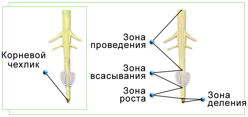 Зона роста и зона деления отвечают за деление клеток и рост корня.