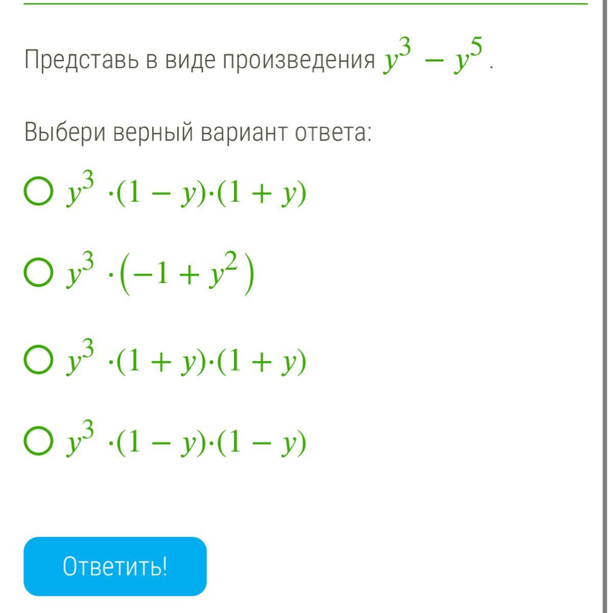 Если вынести y³ за скобку, у нас останется выражение: y³*(1-y²) По формуле разности квадратов решаем: y³*(1-y)*(1+y)