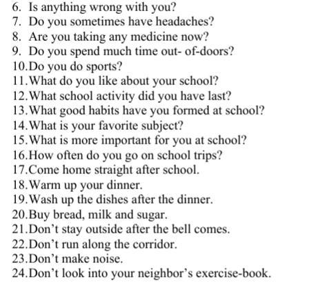 Ответ: 6. С тобой что-то не так? 7. У тебя иногда бывают головные боли? 8. Принимаете ли вы сейчас какие-нибудь лекарства? 9. Вы проводите много времени на улице? 10. Занимаетесь ли вы спортом? 11. Что тебе нравится в твоей школе? 12. Какие школьные занятия у вас были последними? 13. Какие хорошие привычки у тебя сложились в школе? 14. Какой твой любимый предмет? 15. Что для тебя важнее в школе? 16. Как часто вы ходите в школьные поездки? 17. Приходите домой сразу после школы. 18. Разогрей свой ужин. 19. Вымойте посуду после обеда. 20.Купить хлеб, молоко и сахар. 21. Не оставайтесь на улице после звонка. 22. Не беги по коридору. 23. Не шуметь. 24. Не смотрите в тетрадь вашего соседа.