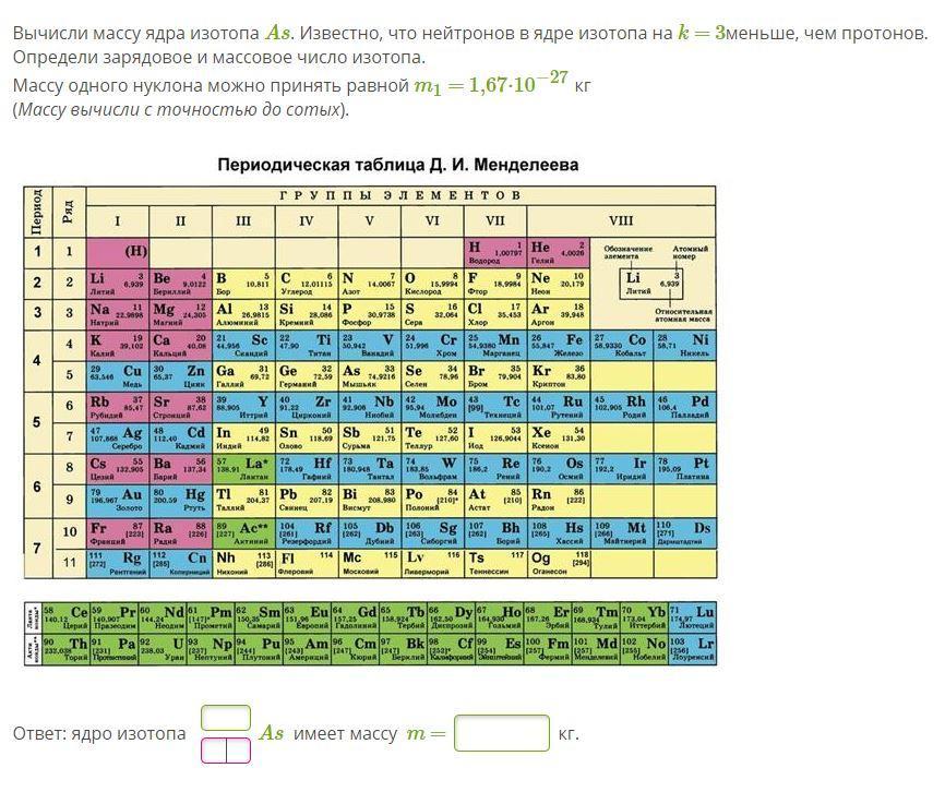 Вычисли массу ядра изотопа As. Известно, что нейтронов в ядре изотопа на k = 3меньше, чем протонов. Определи зарядовое и массовое число изотопа.