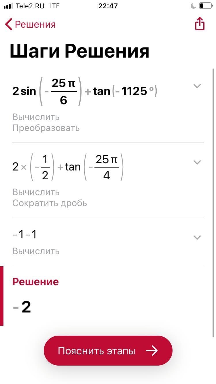 2sin (− 25П/6 )+ tg ( – 1125° ) =-2