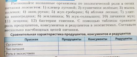 продуценты:1,6,8,10,11, тип питания: автротрофный роль в экосистеме: производят органические вещества из неорганических