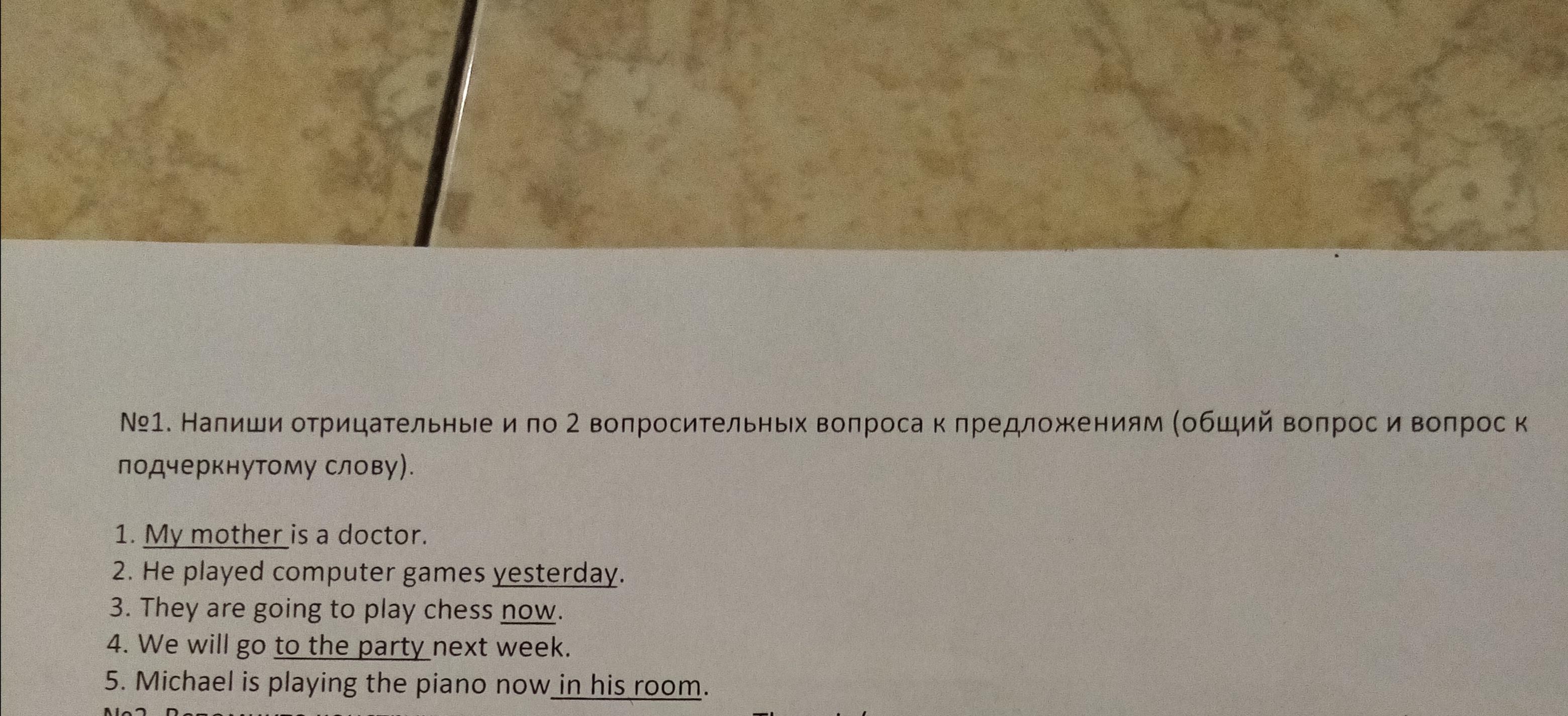 Помогите пожалуйста записать 2 вопросительных вопроса к предложениям (общий вопрос и вопрос и к подчеркнутуму слову) Срочно