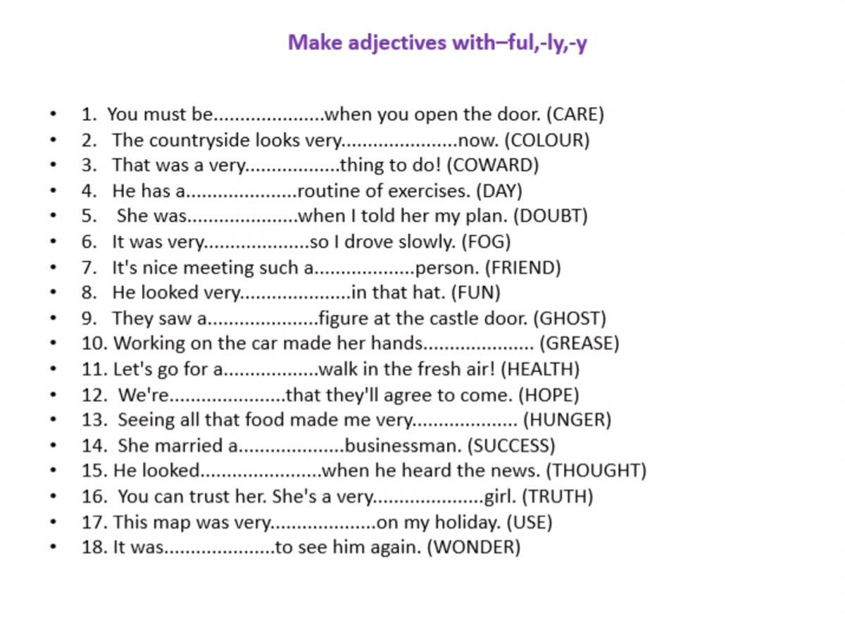 carefully, colourful, cowardly, dayly, doubtful, foggy, friendly, funny, ghostly, greasy, healthy, hopeful, hungry, successful, thoughtful, truthfully, useful, wonderful. могут быть ошибки!