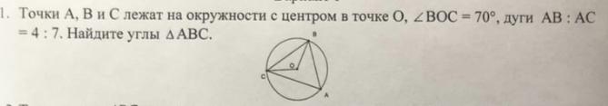1) <BOC = 70°, => <BAC = 70° : 2 = 35° по свойству вписанного угла.
