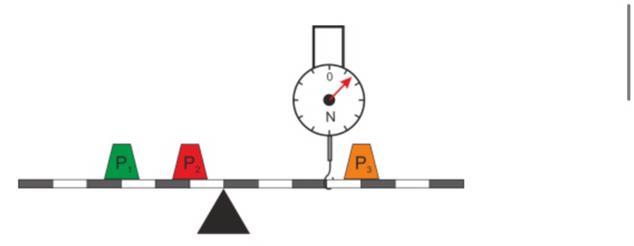 Дан невесомый рычаг, на одной стороне которого находятся два противовеса, их вес равен 1=63Н и 2=95Н. На второй стороне рычага находится противовес 3=434Н и динамометр. Какую силу Д будет показывать динамометр, если рычаг находится в равновесии?