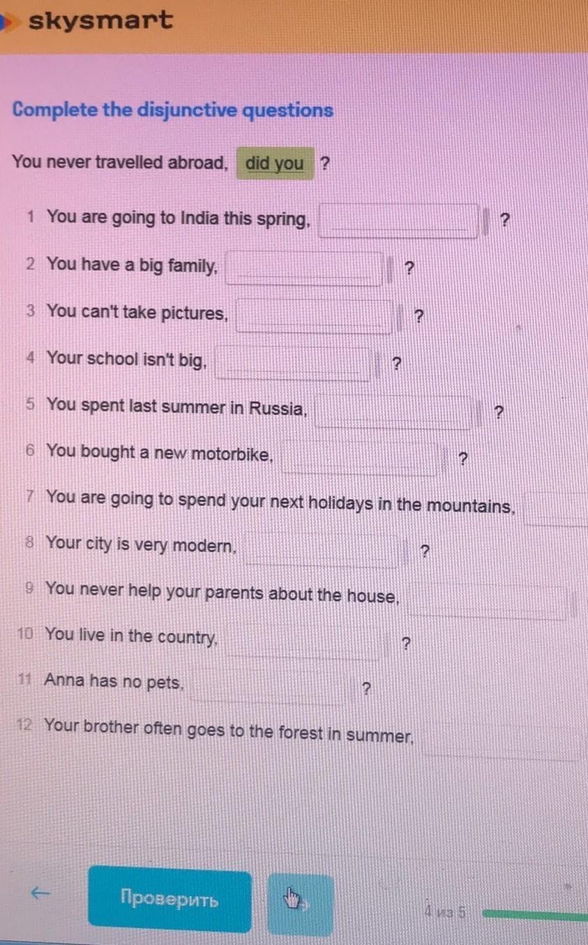 1) aren't you? 2) haven't you? 3) can you? 4) is it? 5) didn't you? 6) don't you? 7) aren't you? 8) isn't it? 9)do you? 10) don't you? 11)has she? 12) doesn't he?