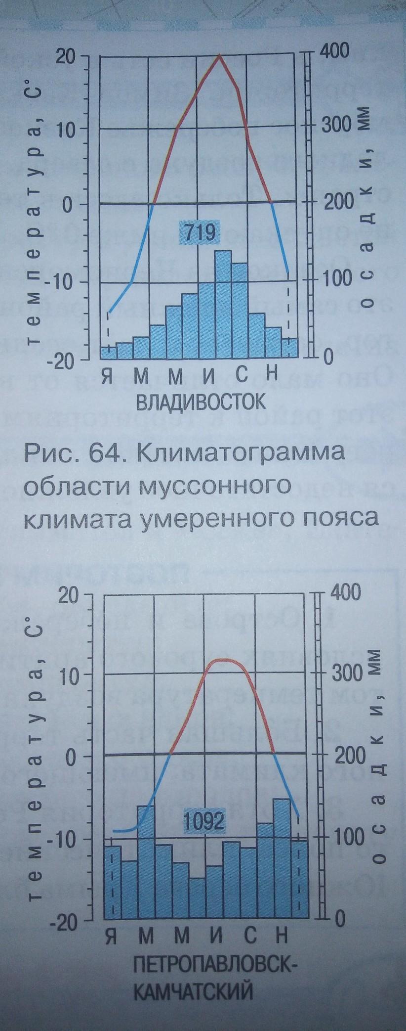 Во Владивостоке заметны большие скачи в осадках и температуре. Зимой очень холодно, температура до - 20, а осадков, крайне мало меньше 50 мм. Летом же многовато осадков, при температуре около 20 градусов , осадков око 150 мм. Надеюсь помог.