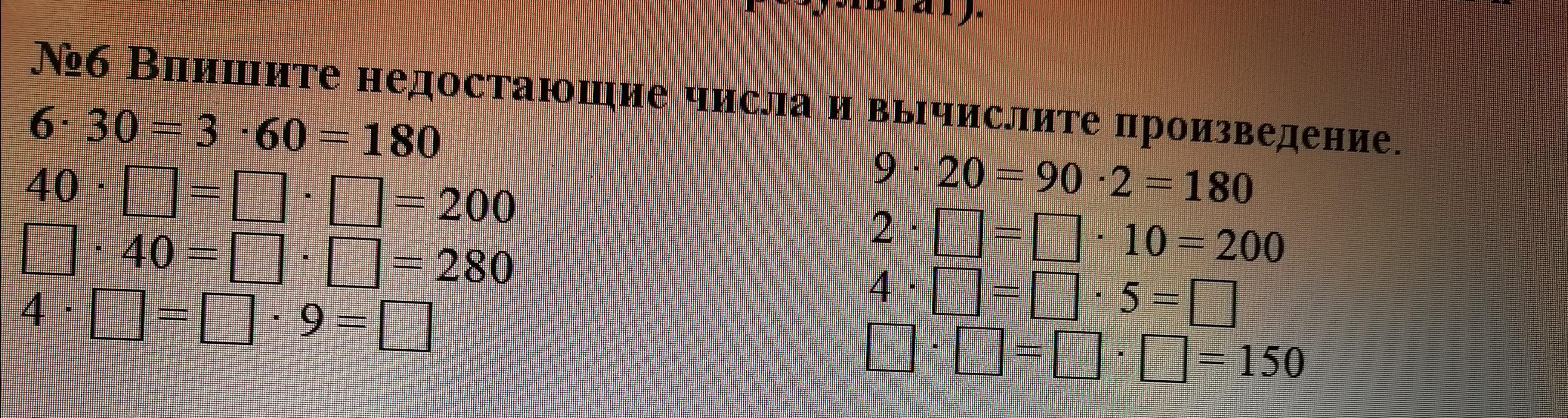 Помогите пожалуйста решить по математике за 3 класс. Буду очень благодарна ❤️. Выпишите недостающие числа и вычислите произведение.
