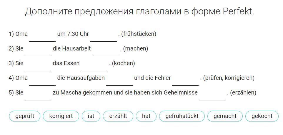 в задании глаголы "ist" и "hat" даются 1 раз, но для образования Perfekt они потребовались многократно!