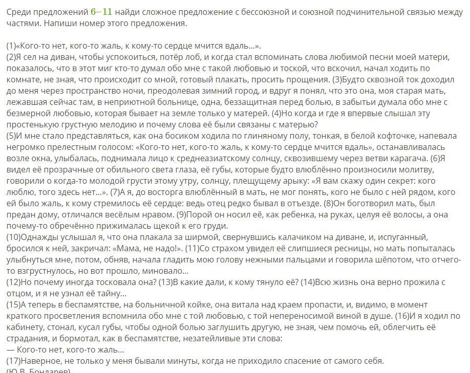 Среди предложений 6–11 найди сложное предложение с бессоюзной и союзной подчинительной связью между частями. Напиши номер этого предложения.