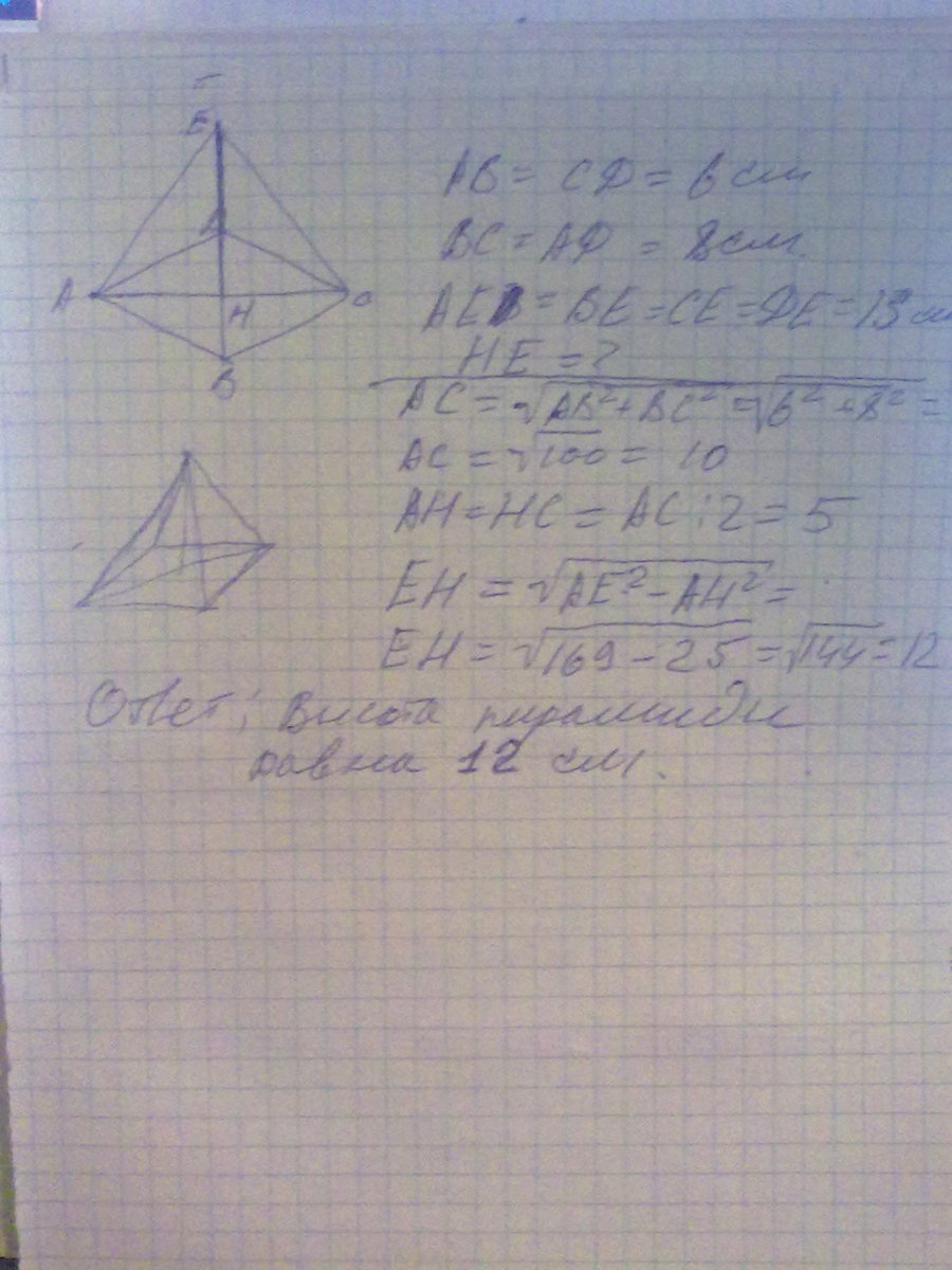 Основание пирамиды- прямоугольник со сторонами 6см и 8см. Боковые ребра пирамиды равны 13см. Найдите высоту пирамиды