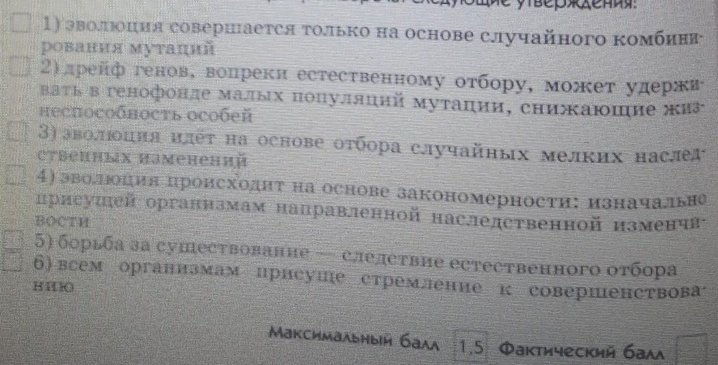 Помогите, пожалуйста, нужно выбрать 3 утверждения, противоречащих теории естественного отбора.