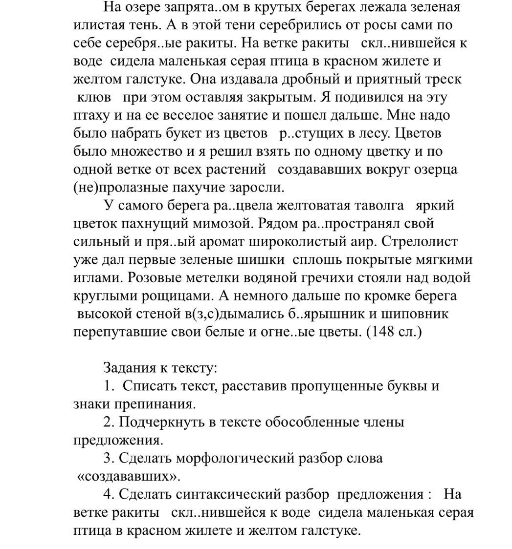 Ответ: На озере, запрятанном в крутых берегах, лежала зеленая илистая тень. А в этой тени серебрились от росы сами по себе серебряные ракиты. На ветке ракиты, склонившейся к воде, сидела маленькая серая птица в красном жилете и желтом галстуке. Она издавала дробный и приятных треск, клюв при этом оставляя закрытым. Я подивился на эту птаху и на ее веселое занятие и пошел дальше. Мне надо было набрать букет из цветов, растущих в лесу. Цветов было множество, и я решил взять по одному цветку и по одной ветке от всех растений, создававших вокруг озерца непролазные пахучие заросли.