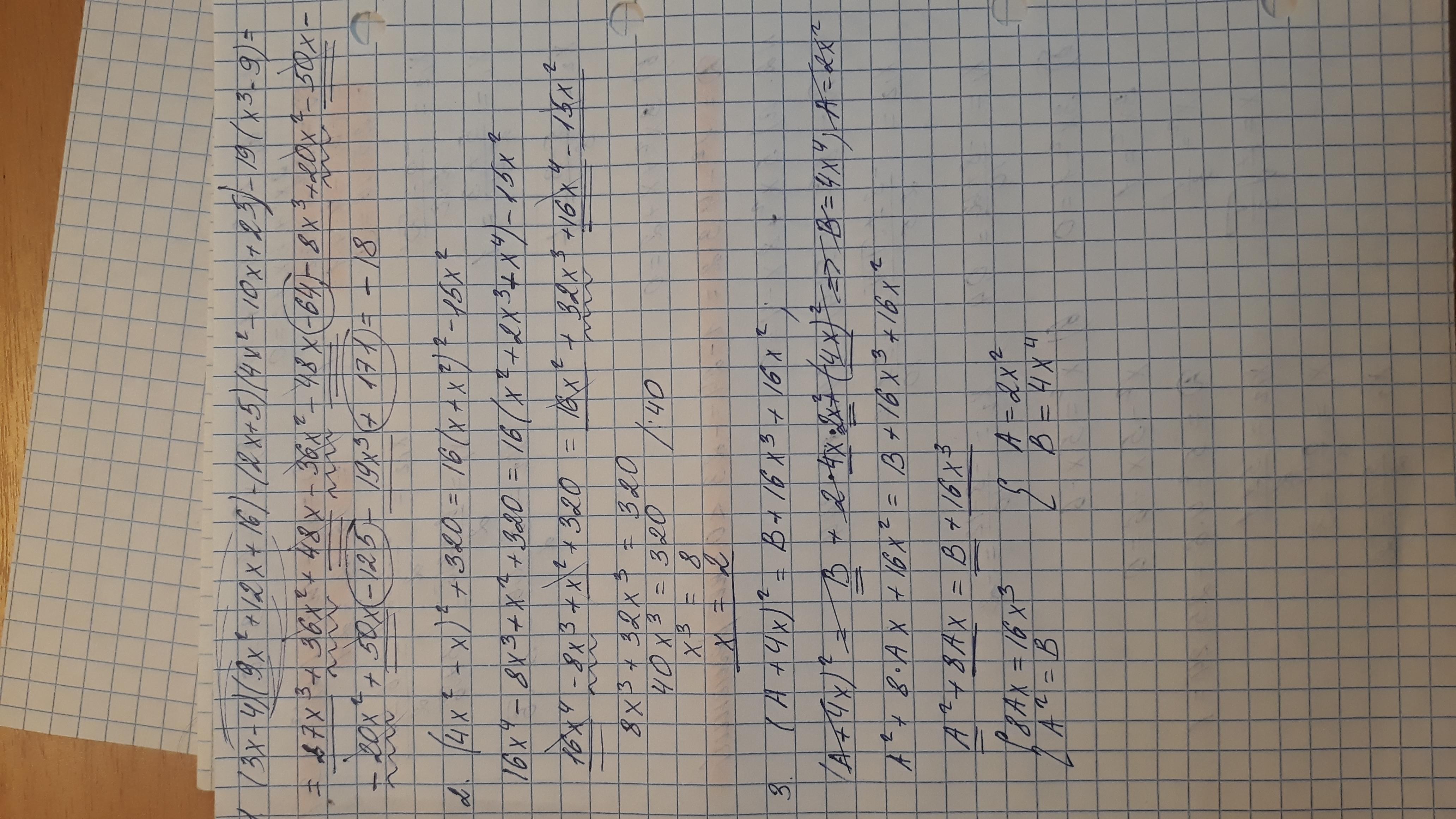 Замените A и B одночленами так, чтобы выполнялось равенство (A + 4x)^2 = B + 16 x^3 + 16 x^2