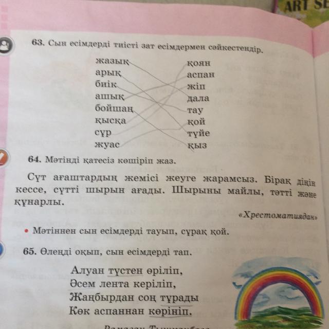 • Мәтіннен сын есімдерді тауып, сұрақ қой.