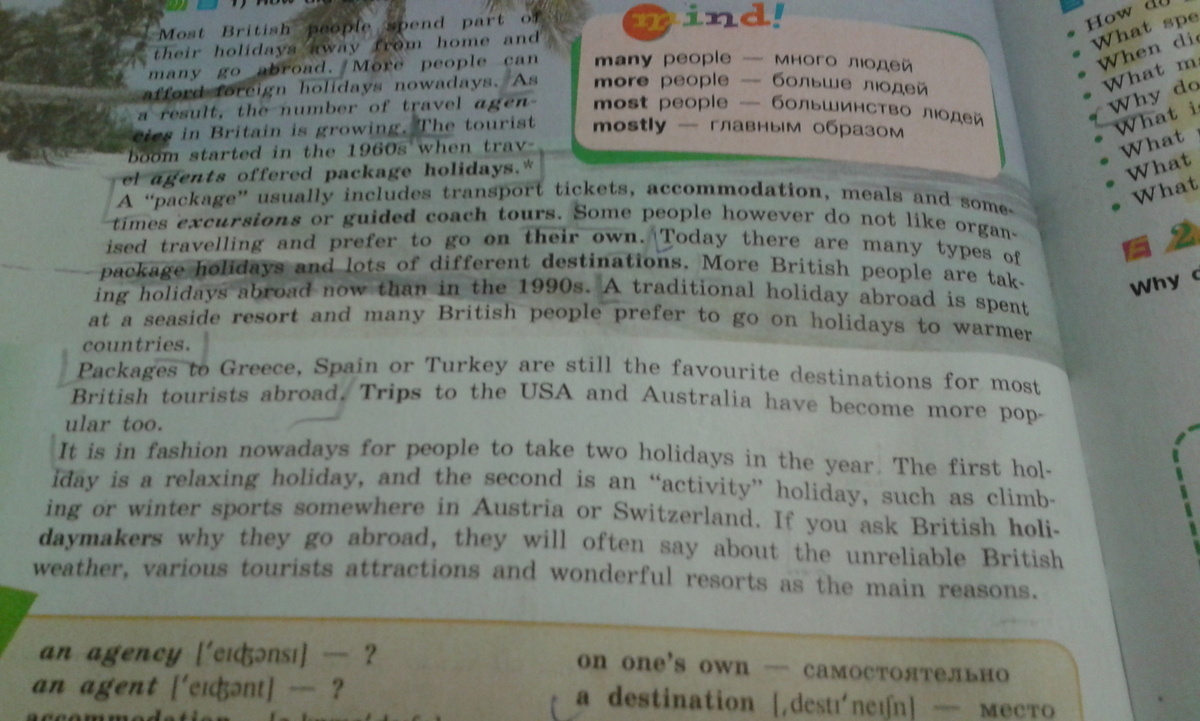 Большинство Британцев проводят часть их отпусков вне дома, и многие ездят за границу. Сегодня многие люди могут позволить себе [проводить] отпуска за границей . Как результат число агентств для путеществий в Британии растет. Туристический бум начался в 1960ые когда агенты по путеществиям начали предлагать "пакетные" туры."пакетные" означает то что в цены путешествия включены цены билетов, цена проживания, еда и иногда экскурсии и туры с гидом. Однако некоторые люди не любят организованные за них путешествия и предпочитают делать все самим. В наши дни есть очень много типов "пакетных" туров и множество направлений. Сегодня больше Британцев проводят праздники заграницей чем в 1990ые. Традиционный отдых заграницей проводится на курортах на морском побережье и много британцев предпочитают путешествовать в теплые страны на свои праздники. "Пакетные" туры в Грецию, Испанию и Турцию все еще остаются наиболее любимыми направлениями для большинства британских туристов за границей. Также набирают популярность путешествия в США и Австралию. Сегодня модно брать 2 отпуска в год. Первый это расслабляющий отпуск а второй активный отпуск, такой как скалолазание или зимние виды спорта где-нибудь в Австрии или Швейцарии. Если вы спросите британских путешественников-отпускников почему они уезжают за границу в отпуск и они часто назовут нестабильную британскую погоду, и наличие за границей множество аттракционов для туристов и прекрасных курортов как основные причины для этого.