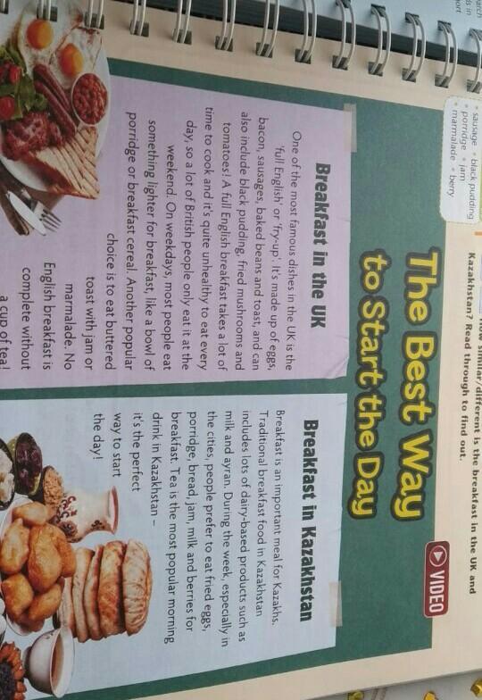 Одним из самых известных блюд в Соединённом Королевстве считается "полный английский". Он приготовлен из яиц, бекона, сосисок, запечеными бобами и тостами, а также может включать в себя черный пудинг, жареные грибы и помидоры! Полный английский завтрак занимает много времени чтобы приготовить его, и он не очень полезный, чтобы есть его каждый день, Так что многие британцы едят его на выходных. В будние дни люди едят более лёгкую пищу как например, тарелку овсянки или хлопья. Другим альтернативным выбором является намазанный маслом тост с джемом и мармаладом(сладкой пастой). Никакой английский завтрак не может быть полным без чашки чая!