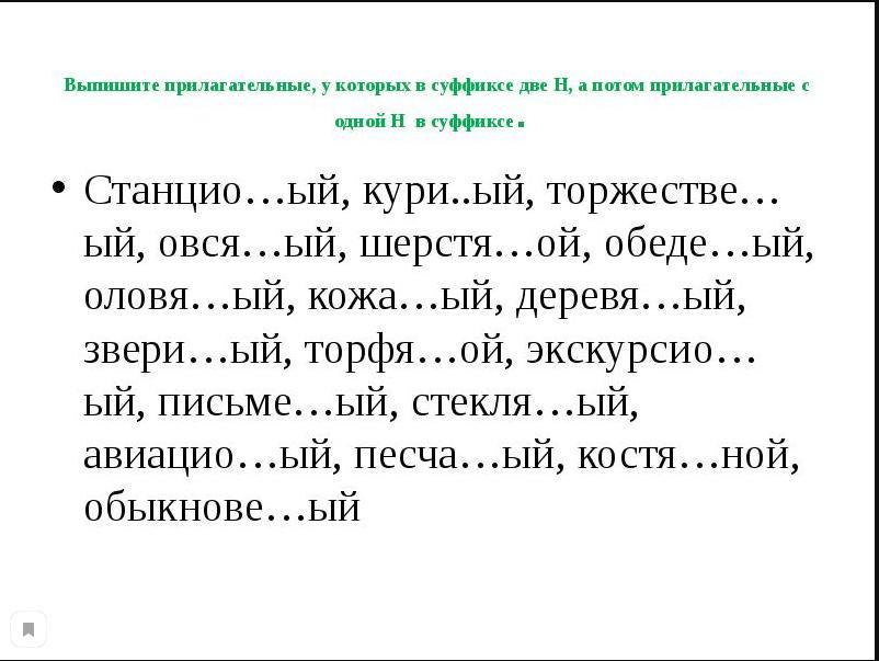 НН) 1) Станционный, 2) Торжественный, 3) Обеденный, 4) Оловянный, 5) Деревянный, 6) Экскурсионный, 7) Письменный, 8) Стеклянный, 9) Авиационный, 10) Обыкновенный.