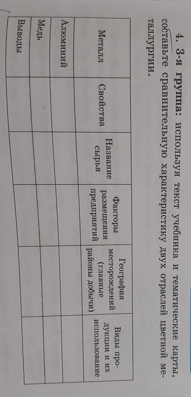 3-я группа: используя текст учебника и тематические карты, составьте сравнительную характеристику двух отраслей цветной металлургии. СРОЧНО!! ПОЖАЛУЙСТА!! Даю 18 баллов! СРОЧНО!